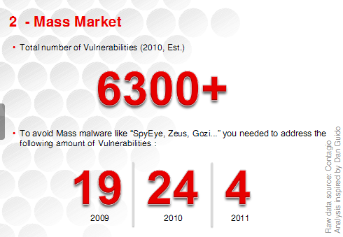 Results : In order to protect against all tracked exploit-kits you had to patch 19 vulnerabilities in 2009, 24 in 2010 and 4 in 2011. That should be hardly a challenge and confirms the sophistication put forward in the Attacker Triad.